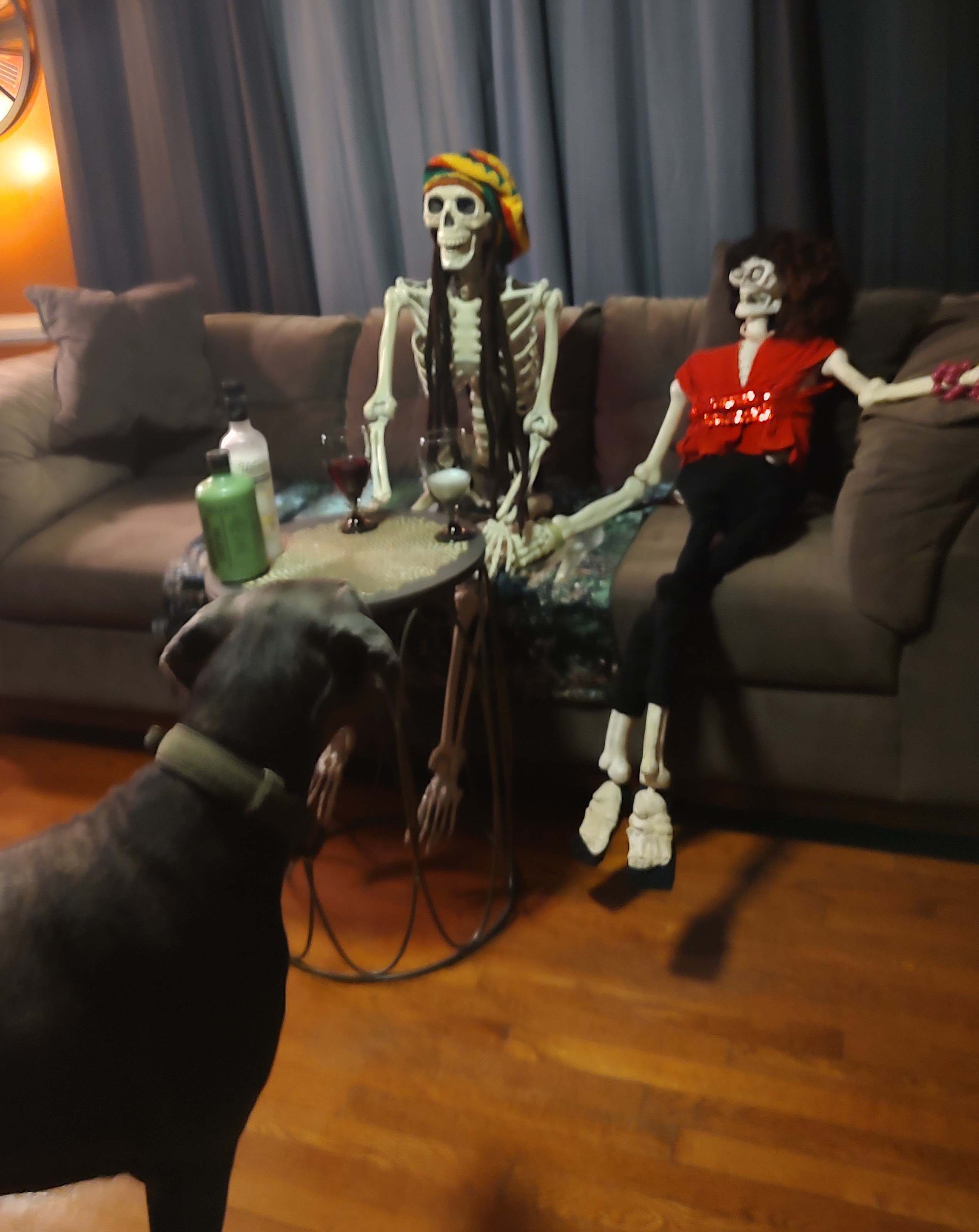 Remember my friend Zilly Boo. She's at Ma's. Babee says Zilly brought along her new beau for Ma's approval before they head for Halloween at K-9 Town. His name is A-Boo. Seems like a nice Skel, Babee says.